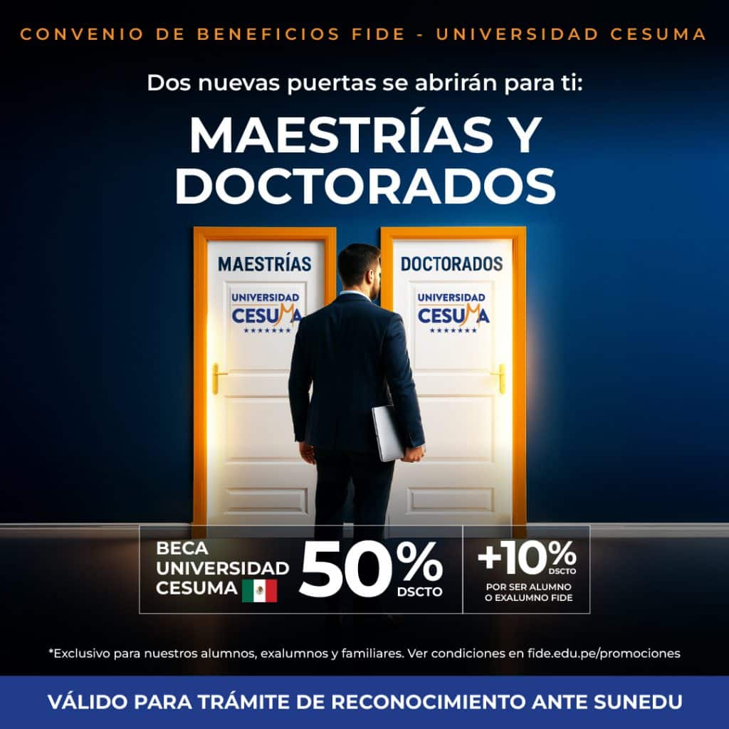 1. Alcance del convenio: El presente convenio aplica exclusivamente para alumnos, exalumnos y familiares directos de FIDE. El beneficio es válido para programas de Maestrías y Doctorados ofrecidos por la Universidad CESUMA.