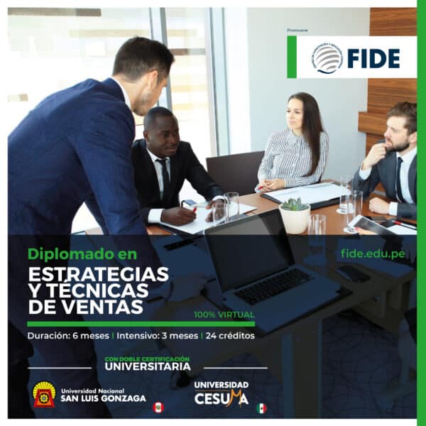 *La certificación emitida por FIDE, será expedida como Diplomado en Técnicas Avanzadas de Ventas y Estrategias Comerciales (600 horas).