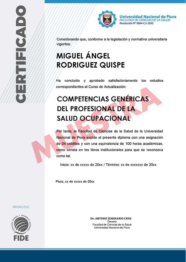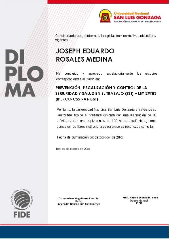 Los participantes que cumplan satisfactoriamente con los requisitos académicos y administrativos del curso recibirán cuatro certificaciones a nombre de FIDE (un certificado por unidad) y una certificación universitaria final como Curso Especializado en “Prevención, Fiscalización y Control de la Seguridad y Salud en el Trabajo (SST)”.
